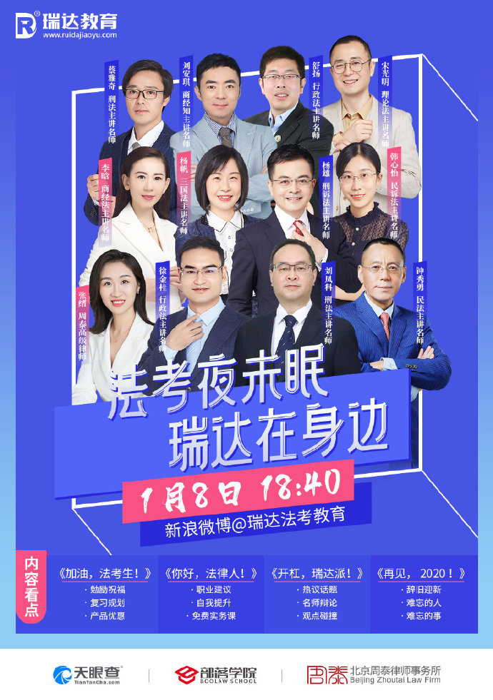 1月8日(今日)晚18:40,瑞達法考教育名師和講師、特邀高級刑辯律師張縉、天眼查、法律部落網,和你一起,憶法考、聊備考、談實務、打辯論。