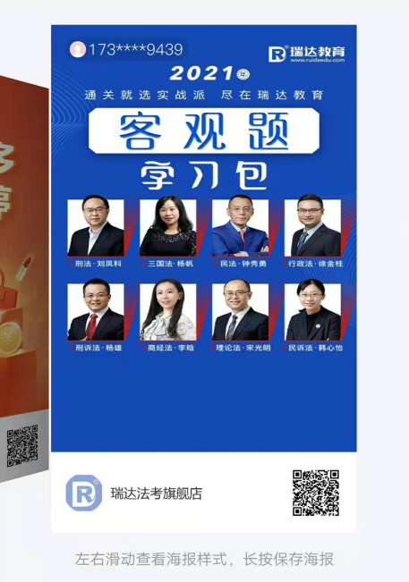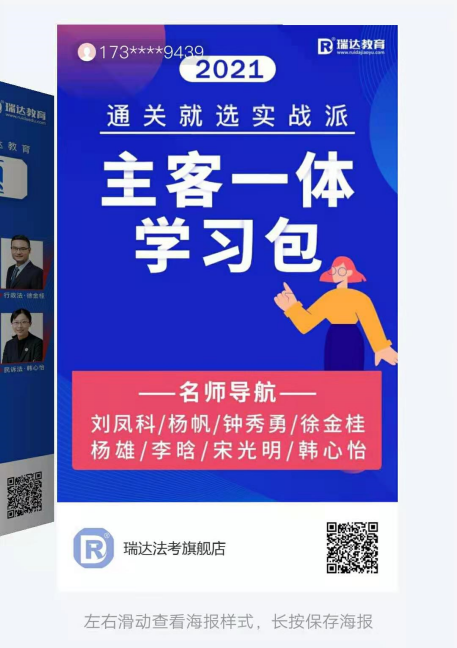 當前提供兩款海報,21年客觀包和21年主客一體包,保存圖片,分享自己的專屬海報,通過海報進入瑞達法考旗艦店進行購買學習包,自己便可以獲得相應的傭金。