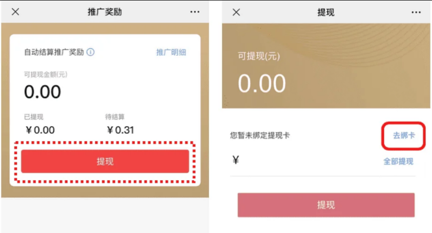 點擊待結算金額,提現→綁定銀行卡→輸入金額→提現。