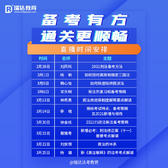 年后如何學,別慌,名師系列直播帶你進入備考狀態!名師直播盡在瑞達法考教育微博,講義上傳會及時告訴大家!