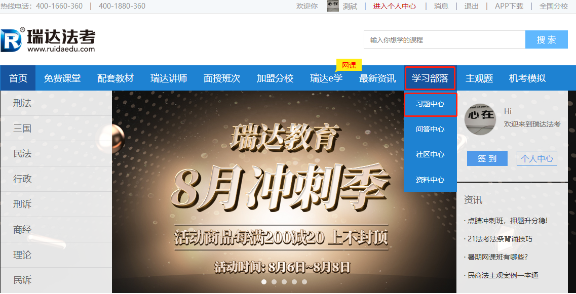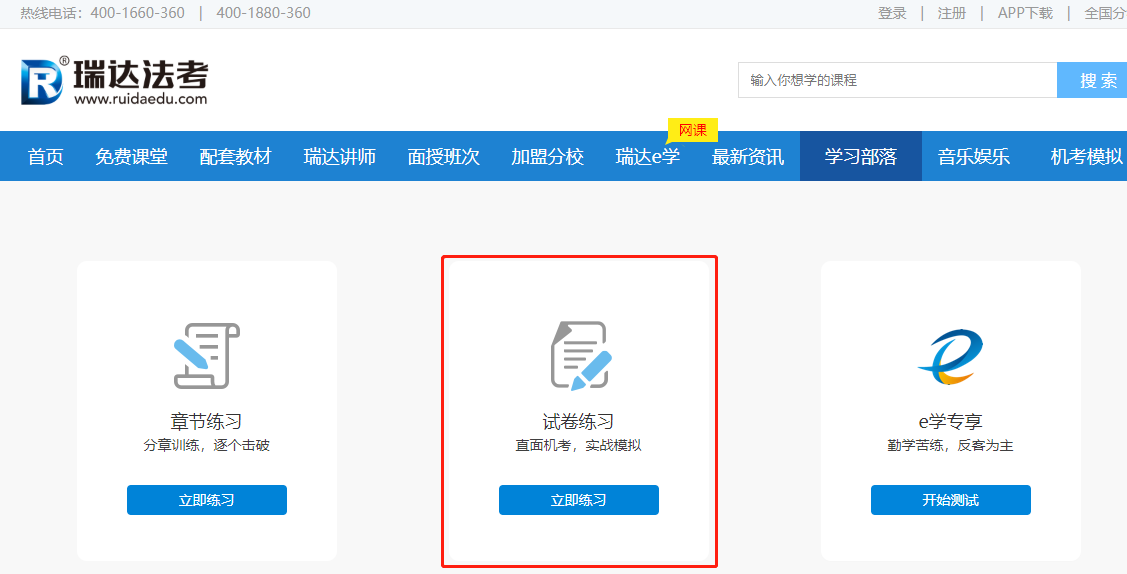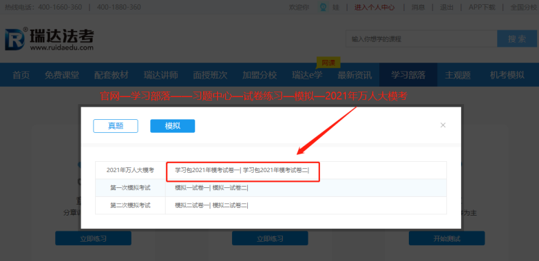 模考地址:瑞達(dá)法考官網(wǎng)(www.hztimes.cn)→學(xué)習(xí)部落→習(xí)題中心→試卷練習(xí)→模擬→2021年萬人模考(學(xué)習(xí)包2021年萬人模考試卷一和學(xué)習(xí)包2021年萬人模考試卷二)