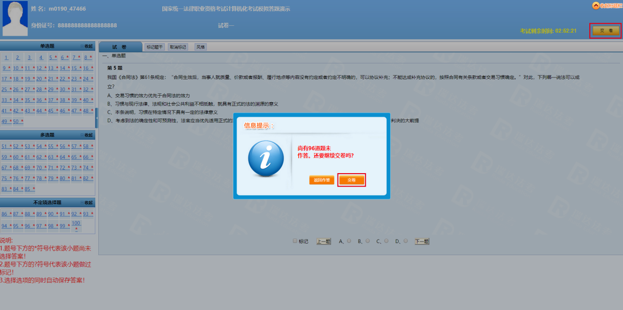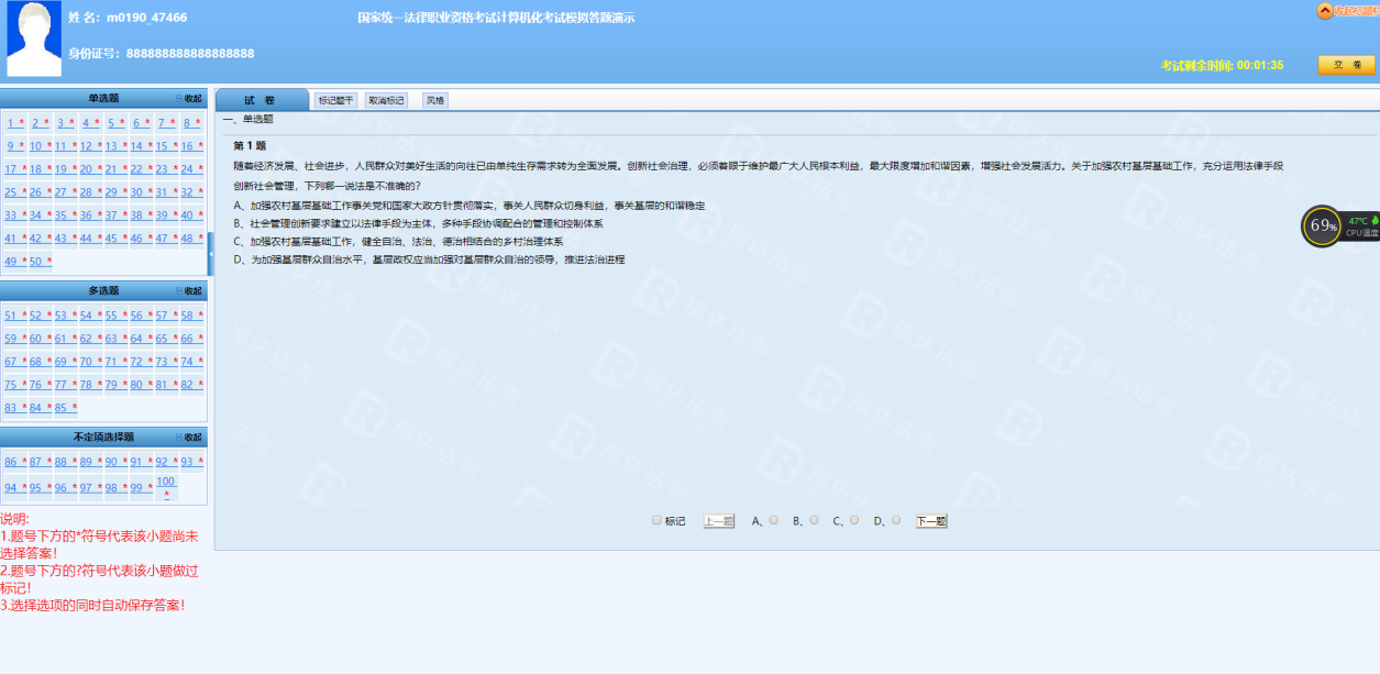 六、進(jìn)入答題頁面,題目類型包括:單選題、多選題、不定項(xiàng)選擇題,右側(cè)為題目的作答區(qū)域,點(diǎn)擊下方選項(xiàng)進(jìn)行答案選擇,并且可以對題目進(jìn)行標(biāo)記;左側(cè)區(qū)域?yàn)榇痤}卡區(qū)域,點(diǎn)擊可切換題目;考試時(shí)間結(jié)束后會自動進(jìn)行試卷提交或者點(diǎn)擊右上角“交卷”按鈕進(jìn)行提交。