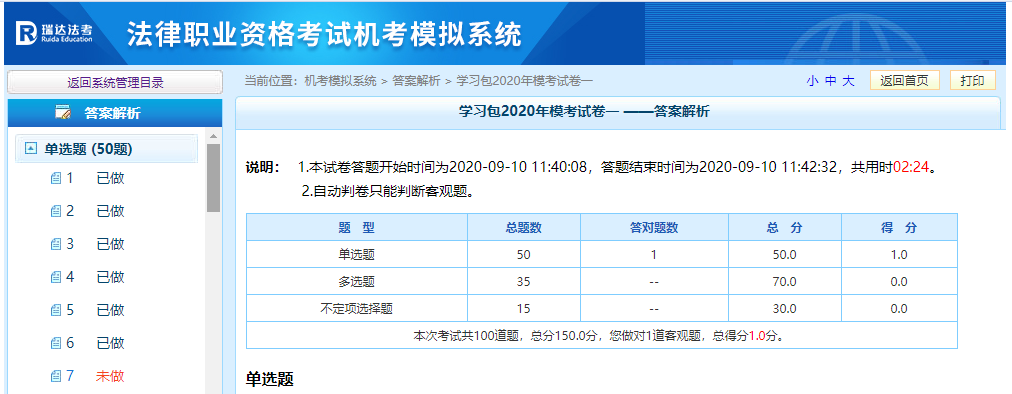 八、交卷之后,立即可以查詢本試卷的總得分、答對題數(shù)、單選題、多選題、不定項(xiàng)選擇題的分?jǐn)?shù)、同時(shí)可以查看本次考試試卷的答案解析。
