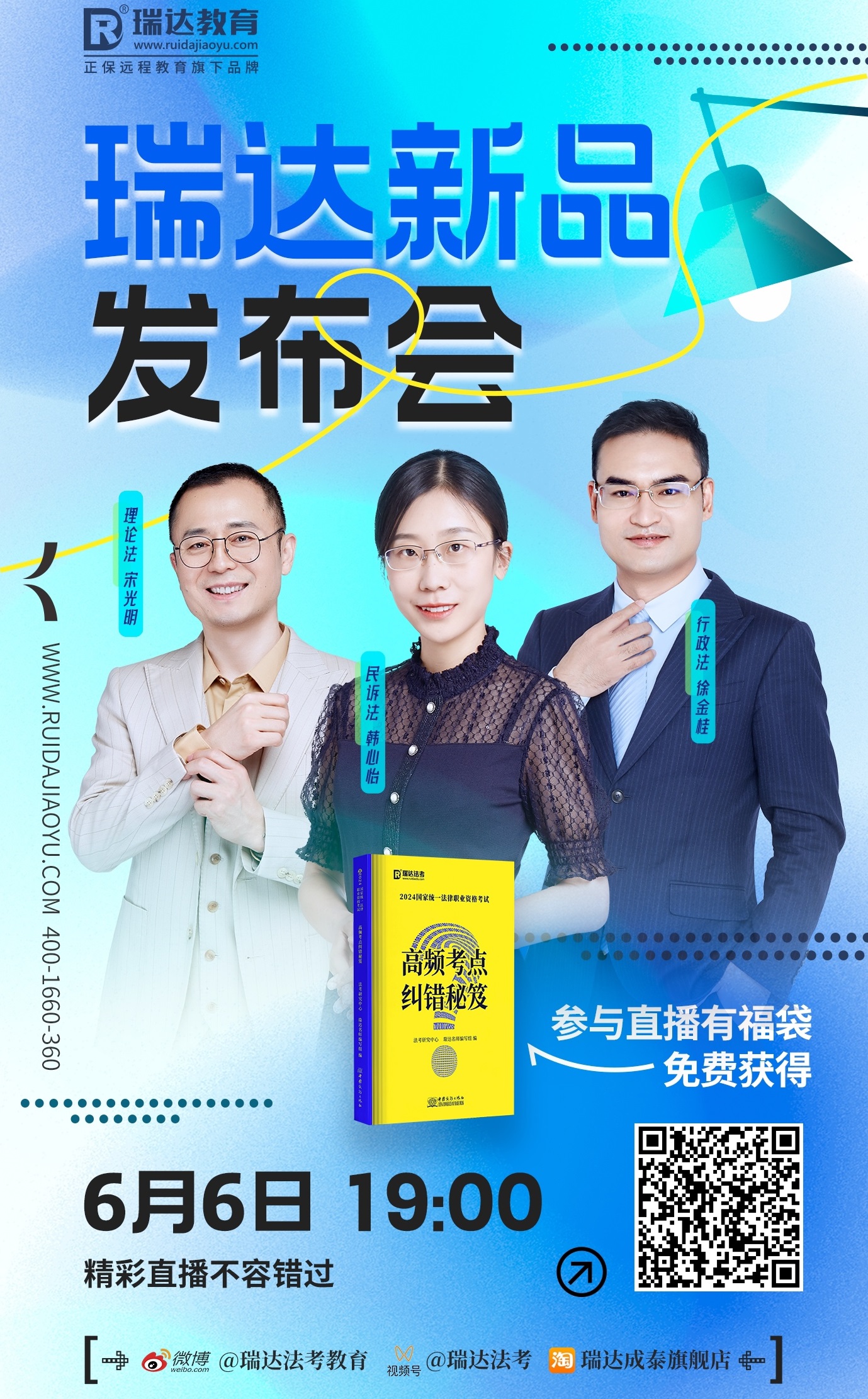 24瑞達新品發布會,今晚19:00,微博@瑞達法考教育、@瑞達法考視頻號、@天貓瑞達成泰旗艦店,三平臺同步直播。