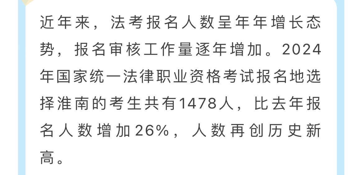 根據淮南司法的最新公告得知:今年報名地選擇淮南的考生共有1478人,比去年報名人數增加26%,人數再創歷史新高。