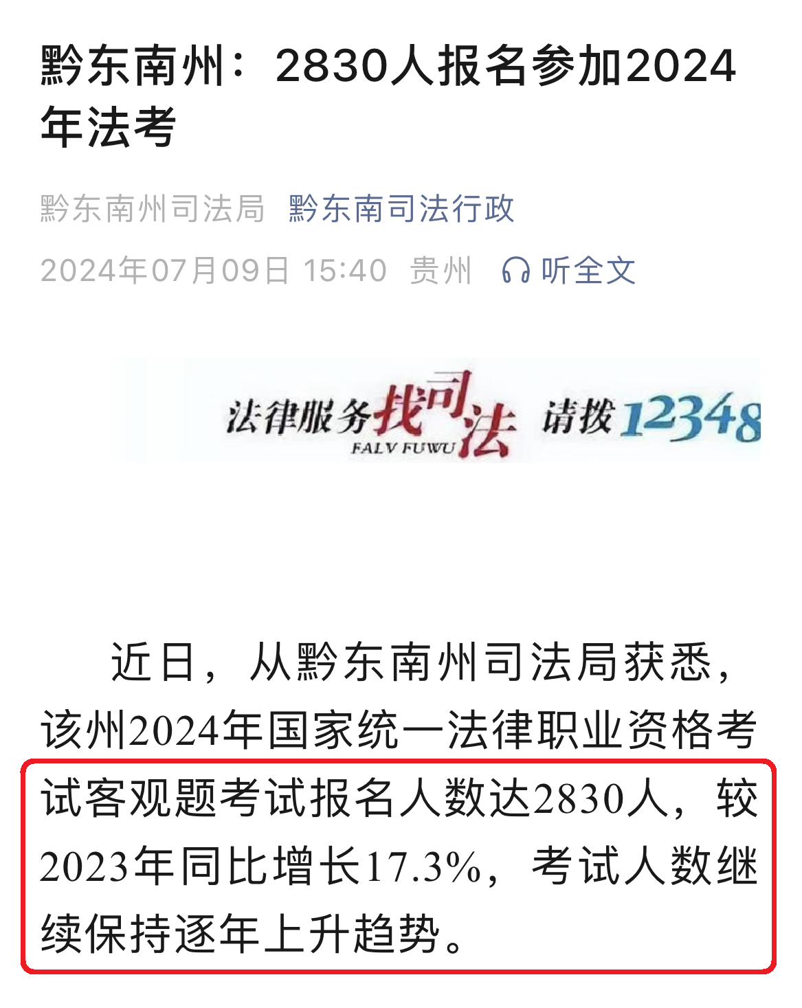 根據黔東南州司法局發布的最新公告得知:今年黔東南州報名人數達2830人,較2023年同比增長17.3%,考試人數繼續保持逐年上升趨勢。