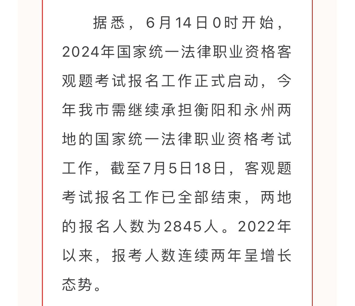 根據法潤衡陽的最新公告得知:今年我市需繼續承擔衡陽和永州兩地的國家統一法律職業資格考試工作。兩地的報名人數為2845人。2022年以來,報考人數連續兩年呈增長態勢。