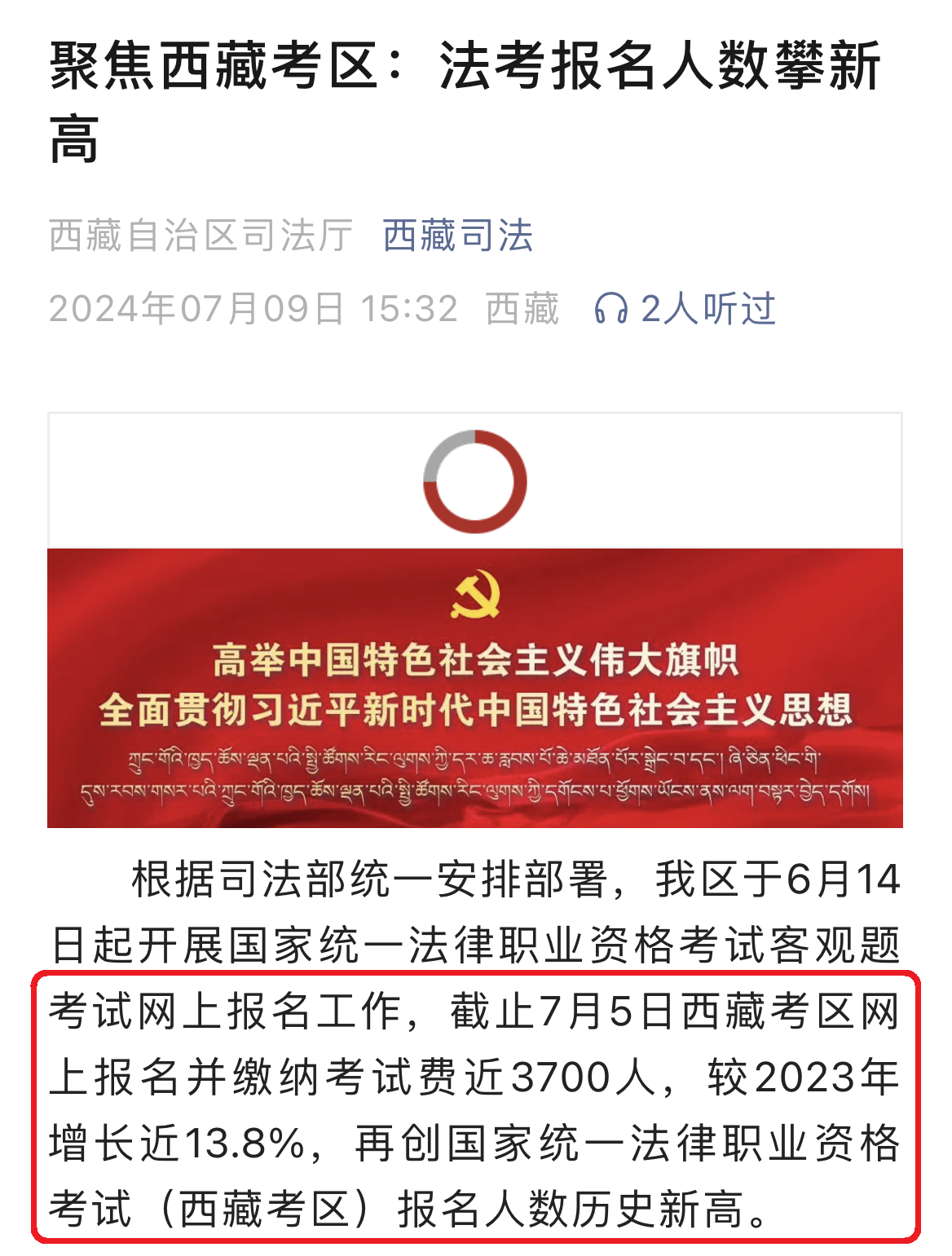 根據西藏自治區司法廳發布的最新公告得知:西藏考區網上報名并繳納考試費近3700人,較2023年增長近13.8%,再創歷史新高。