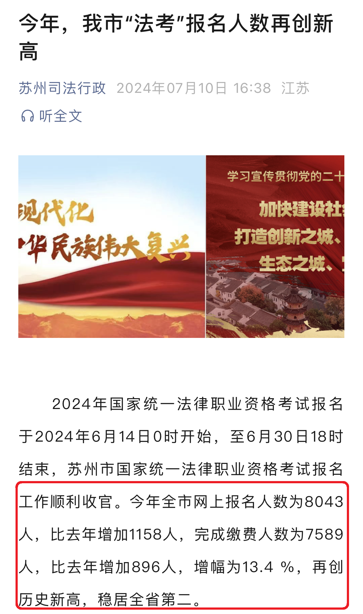 根據蘇州司法行政發布的最新公告得知:今年江蘇蘇州網上報名人數為8043人,比去年增加1158人,完成繳費人數為7589人,比去年增加896人,增幅為13.4 %,再創歷史新高,穩居全省第二。