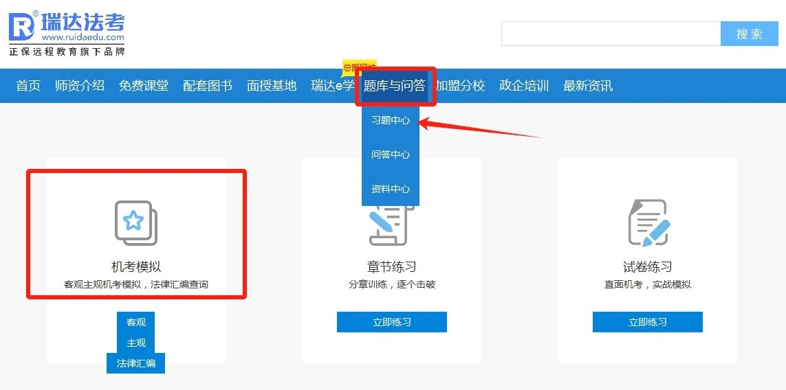 電腦端:考試當天進瑞達法考官網www.hztimes.cn,點擊菜單欄【題庫與問答-習題中心】,選擇【機考模擬-客觀】,即可開始作答。