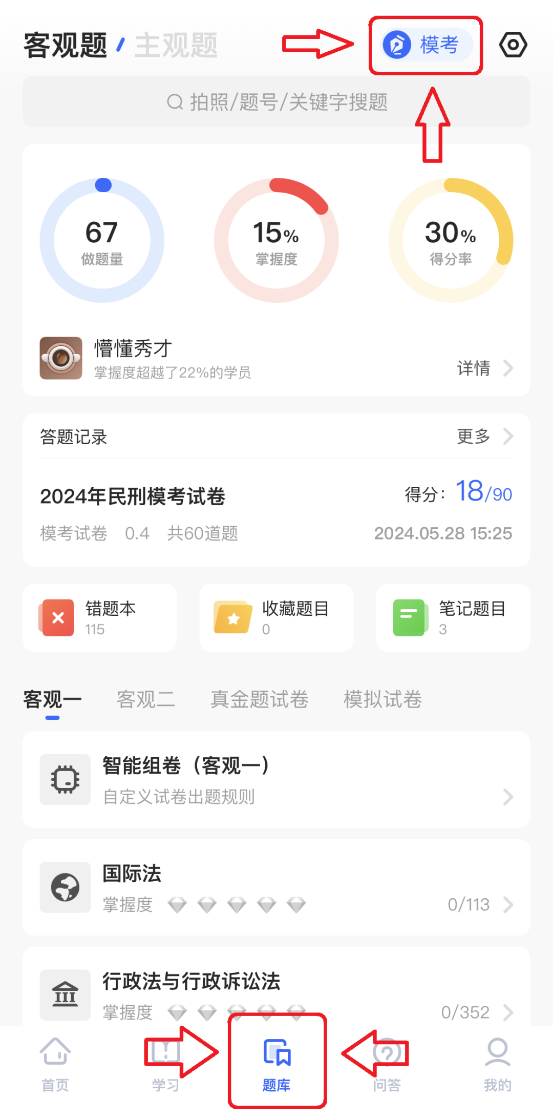 手機端:考試當天打開瑞達法考APP,點擊底部菜單欄【題庫】,點擊右上角【??肌?,看到??荚嚲砗螅c擊【開始考試】即可開始作答。