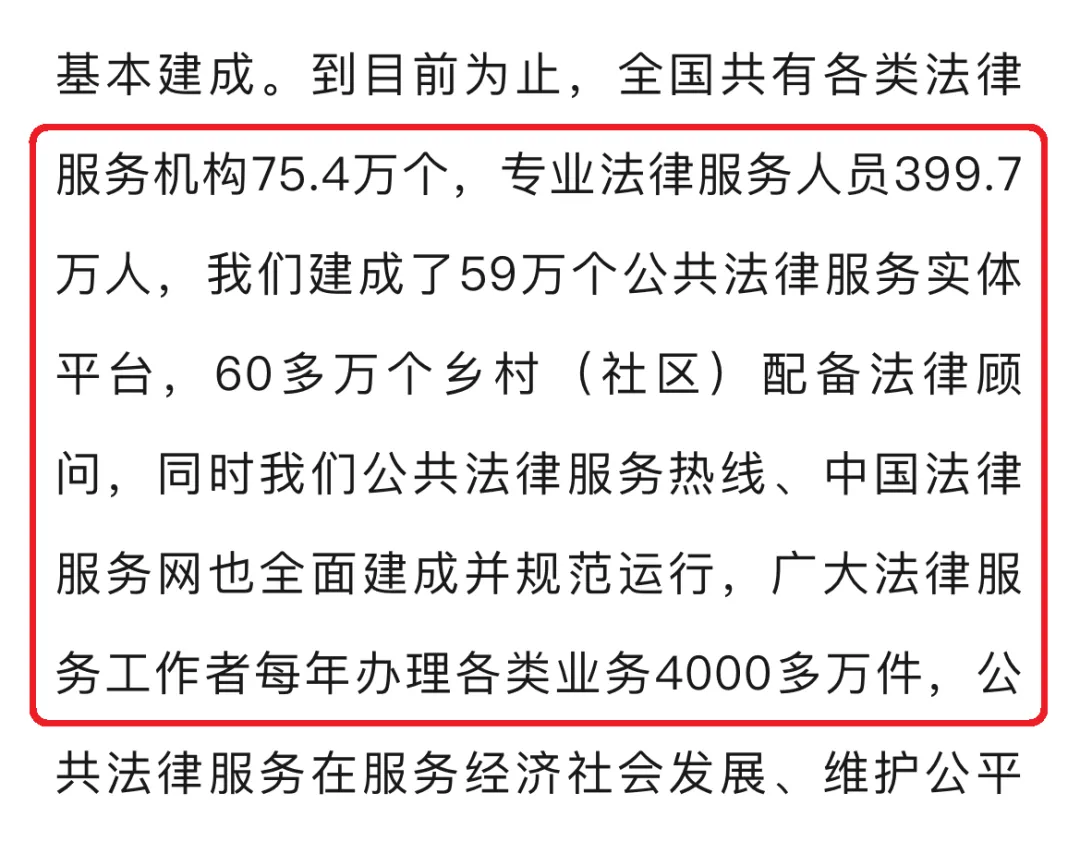 截至目前,全國共有各類法律服務機構75.4萬個,專業法律服務人員399.7萬人,建成59萬個公共法律服務離線實體平臺,60多萬個鄉村(社區) 配備法律顧問,廣大法律服務工作者每年辦理各類業務4000多萬件。
