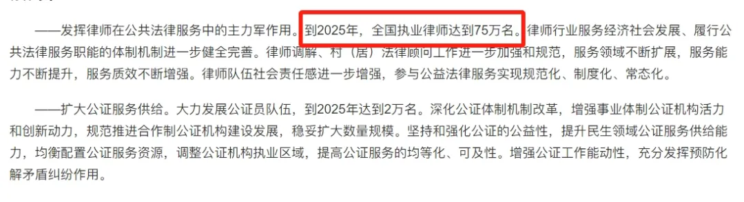 在司法部印發的《全國公共法律服務體系建設規劃(2021-2025年)》中明確表示,到2025年,全國執業律師達到75萬名。看來已提前完成該目標。