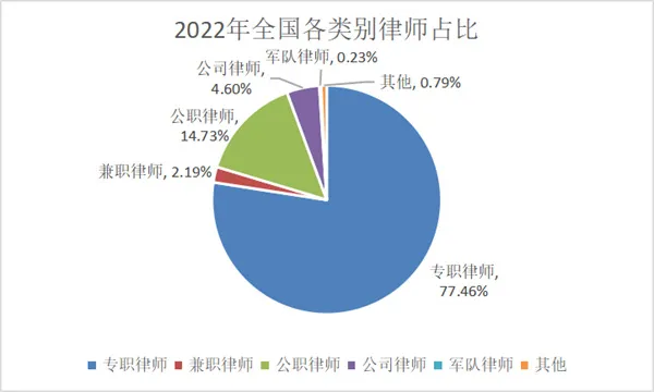 專職律師占77.46%,兼職律師占2.19%,公職律師9.59萬占14.73%,公司律師占4.6%,軍隊律師占0.23%。