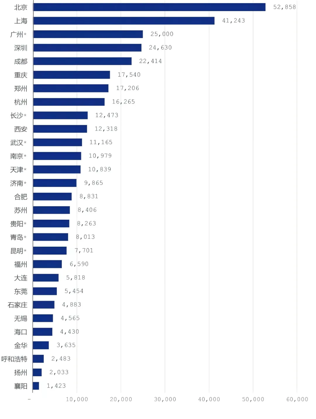 目前,國內共計13座城市律師人數破萬。分別為北京(52858人)、上海(41243人)、廣州(25000人)、深圳(24630人)、成都(22414人)、重慶(17540人)、鄭州(17206人)、杭州(16265人)、長沙(12473人)、西安(12318人)、武漢(11165人)、南京(10979人)、天津(10839人)。