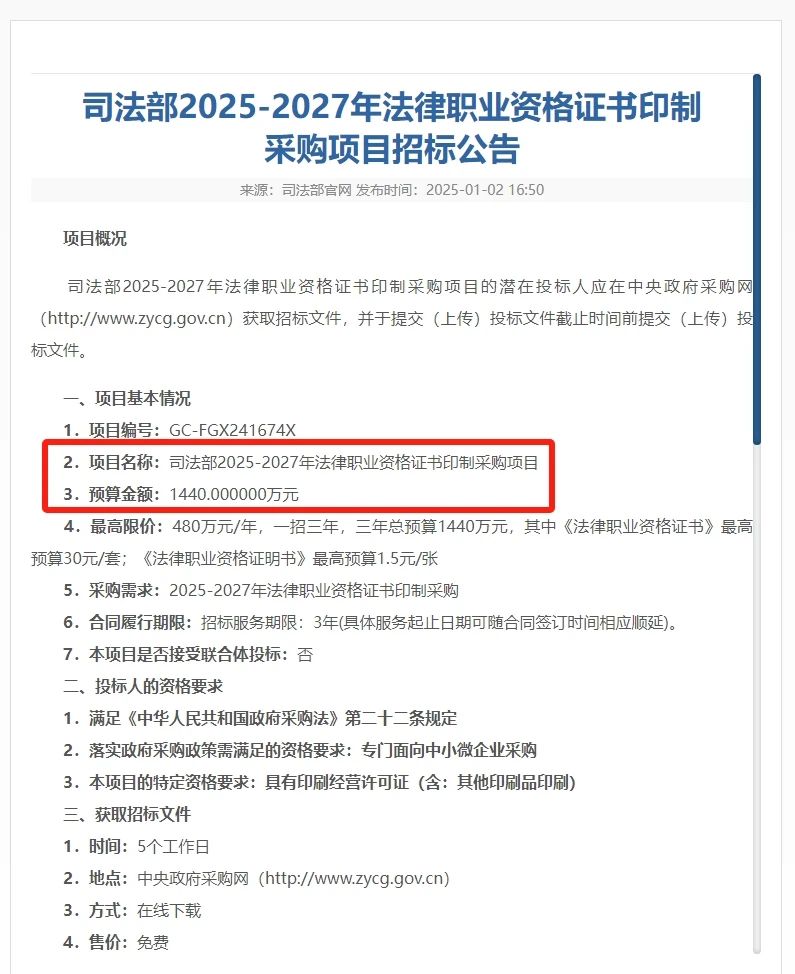1月2日,司法部發布了2025-2027年法律職業資格證書印制采購項目招標公告: