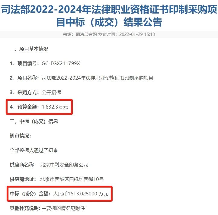 就此之前,司法部曾發布2022-2024年法律職業資格證書印制采購項目中標(成交)結果公告。其中提到:2022-2024年法律職業資格證書印制采購項目預算金額為1632.3萬元,中標(成交)金額為1613萬元。