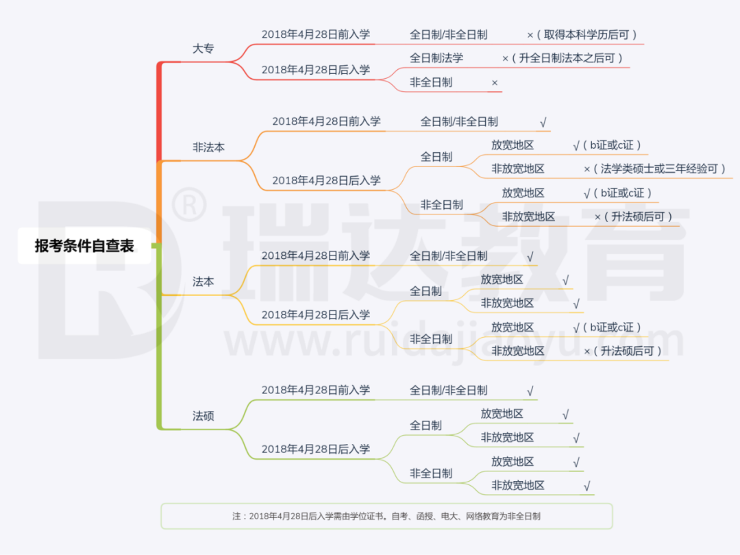 老人老辦法:2018年4月28日之前入學(取得學籍),不論非全日制與全日制本科,不論法本與非法本,自考、專升本、網(wǎng)絡教育、成人教育都能考,且往后一直能考。
