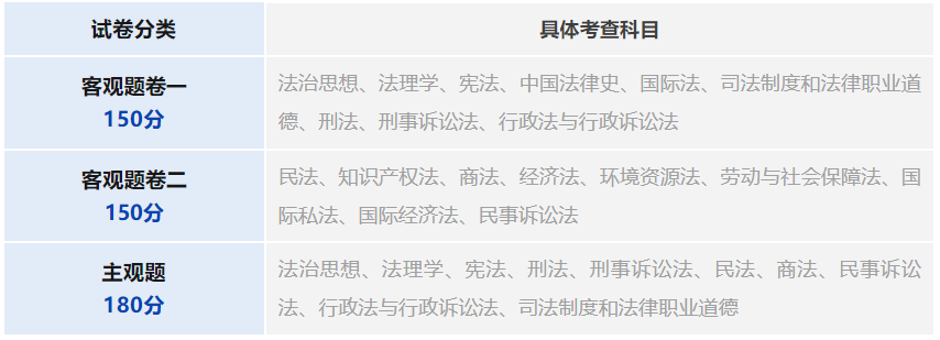 法考客觀題考試共兩卷,分為試卷一、試卷二,每張試卷100道試題,分值為150分。